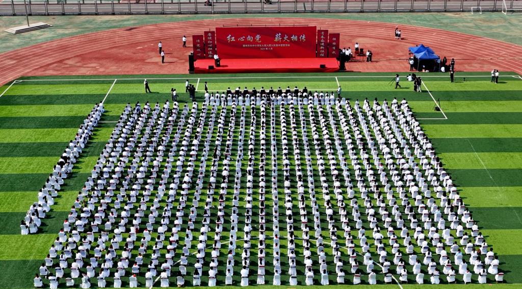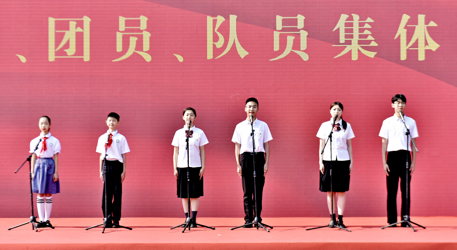 活动在庄严的国歌声中拉开帷幕。护卫队员迈着铿锵有力的步伐,护送党旗、团旗、队旗庄严入场。300名新发展党员、300名新发展团员、300名新入队队员代表集体献词,以青春之声礼赞伟大时代。