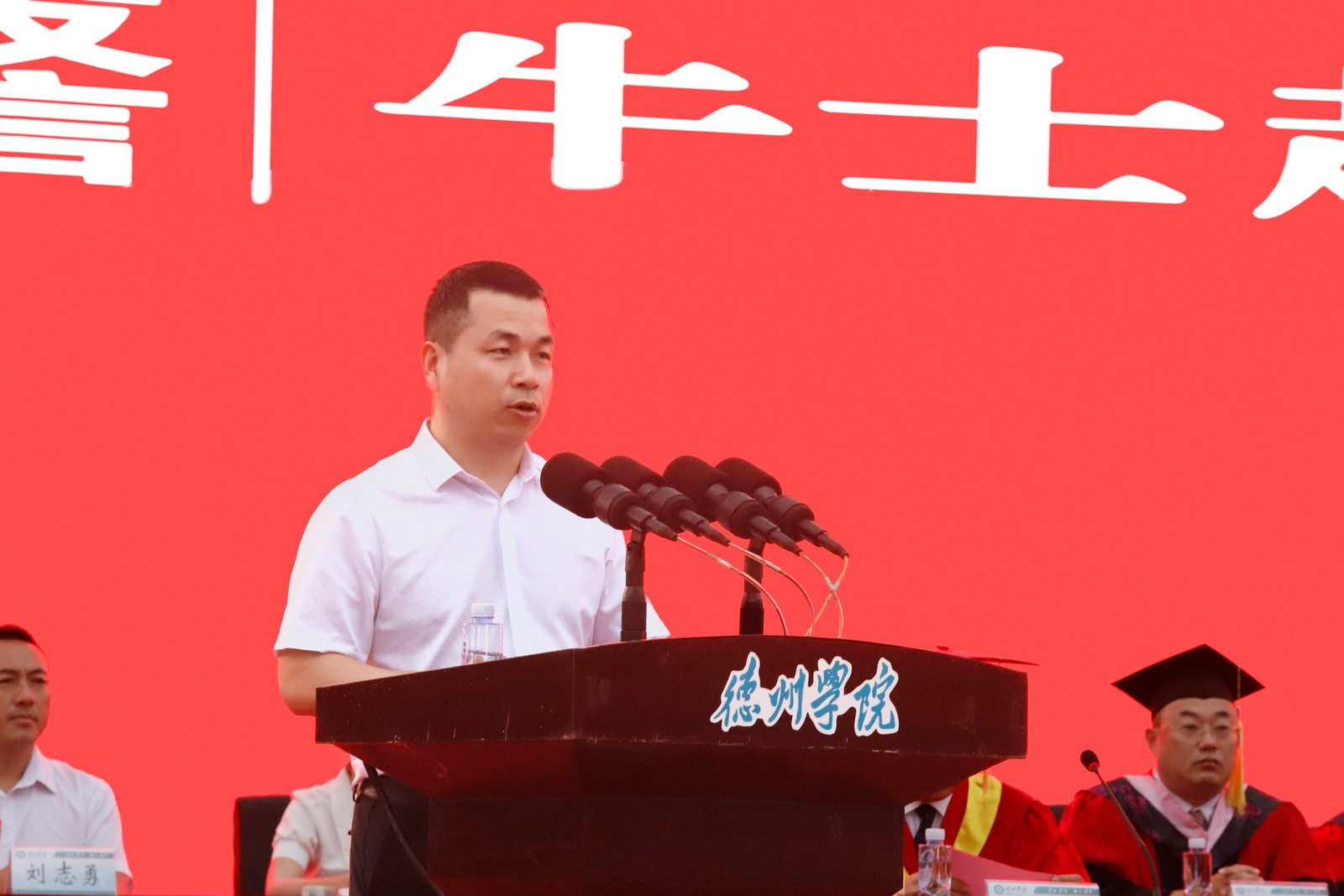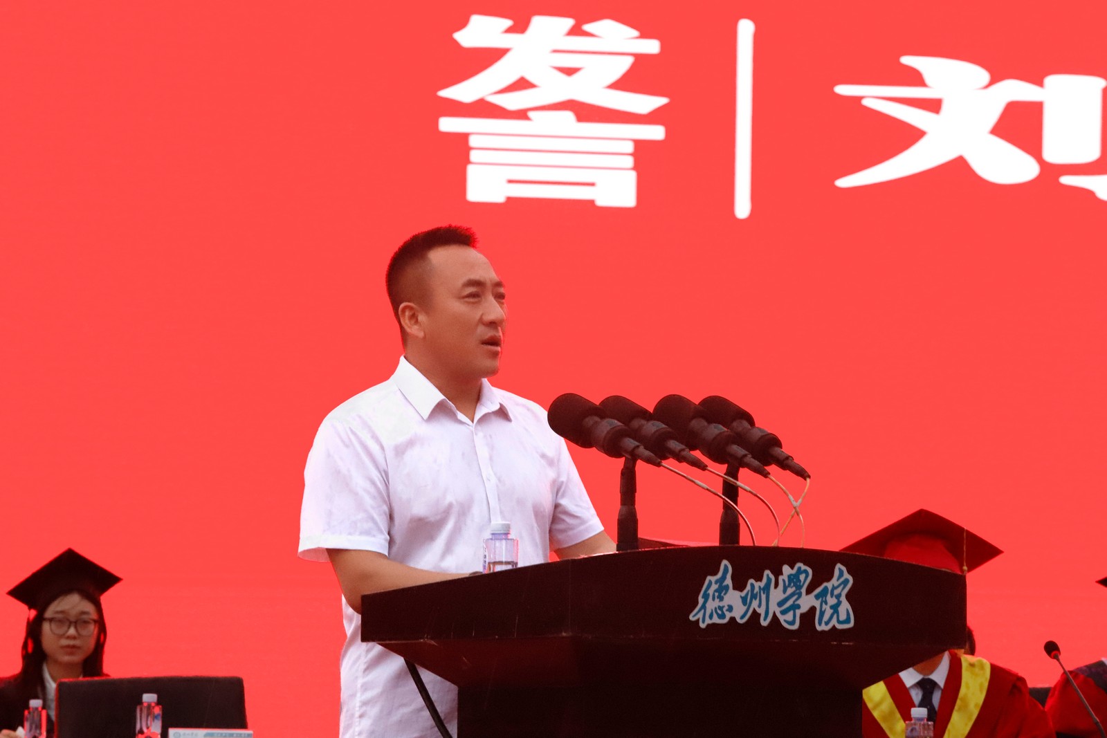 毕业生家长代表、美术学院刘格泽父亲刘志勇发言,叮嘱同学们要常怀感恩之心,传承德院精神,勇敢追梦,在实现个人价值的同时,不忘用所学所长服务社会、报效祖国,用智慧和汗水书写属于自己的精彩篇章。