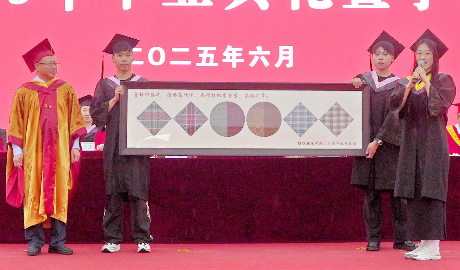 吴君代表学校接收纺织服装学院2025届毕业生集体创作的艺术作品《四载春秋》。