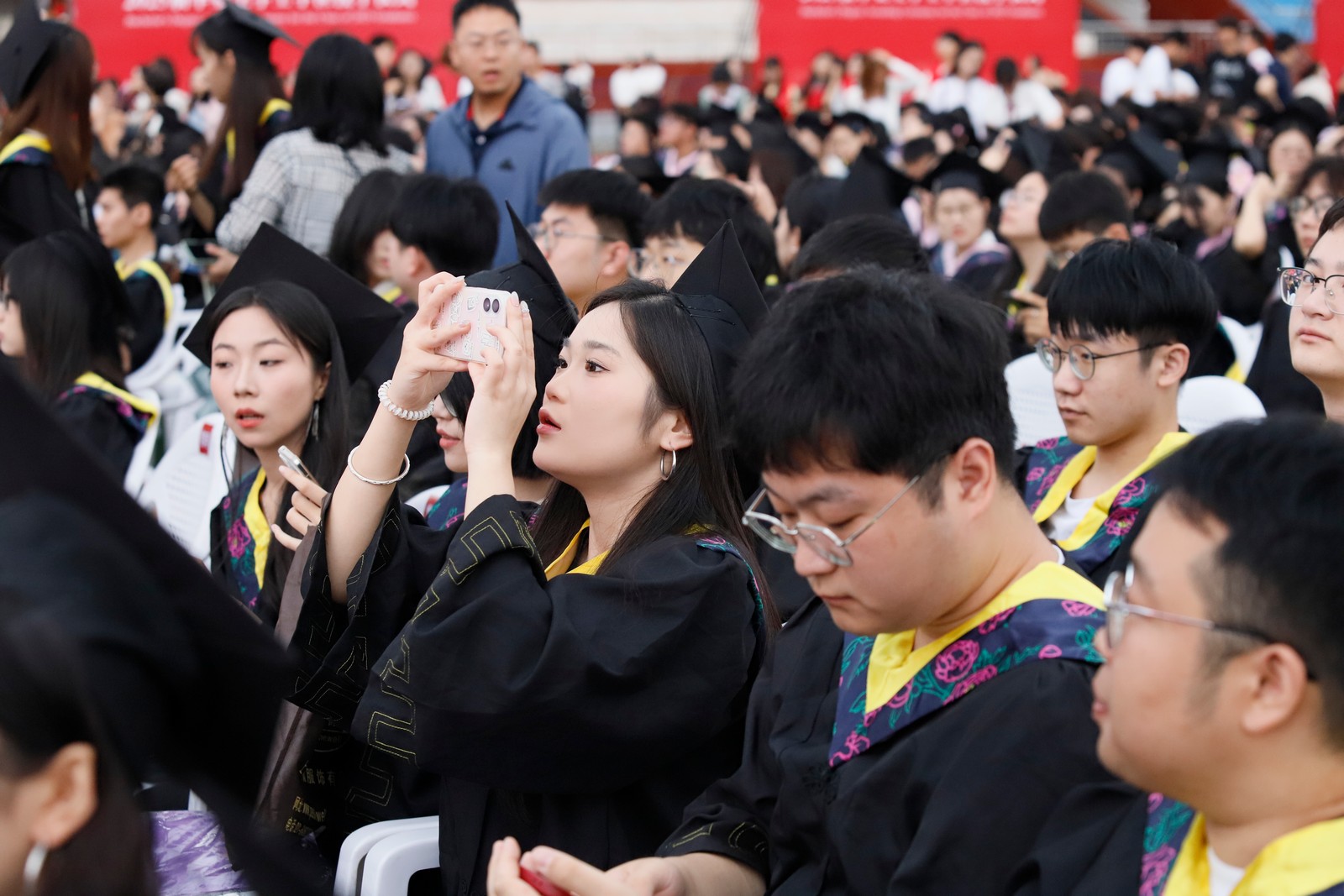 赵长林作题为“大力弘扬德院精神,把青春奋斗融入强国复兴新征程”的讲话。他代表学校向顺利完成学业的同学们表示祝贺,向为学生成长成才辛勤付出的广大教职员工及学生家长,致以崇高的敬意和衷心的感谢。他说,四年来,同学们践行“崇德启智、励志博学”的校训,把青春奋斗融入强国复兴伟业;涵养“勤学善思、知行合一”的学风,交出不负韶华的青春答卷。 赵长林勉励毕业生,要做有远大理想的青年人,唯有扎根伟大时代、树立远大志向、拥有强大的自信和意志力、锤炼过硬本领才能成功、才会成功;要做有责任担当的青年人,只要坚定不移听党话、跟党走,做有理想、敢担当、能吃苦、肯奋斗的新时代好青年,在推进强国建设、民族复兴伟业中有责任担当、有奉献作为,就会有光辉的前程和事业的成功;要做善于终身学习的青年人,永远保持对世界和未来的好奇心、对知识的渴望,在社会的大课堂里不断更新知识结构,提升面向未来的核心素养与竞争力,在充满不确定性的激烈竞争中奋勇向前,去实现新的人生价值;要做求真务实的青年人,凭借实干与韧性,不驰于空想,不骛于虚声,从基层做起,从小事做起,在平凡的岗位上追求卓越,用勤劳的双手和智慧的头脑创造出不平凡的精彩人生。