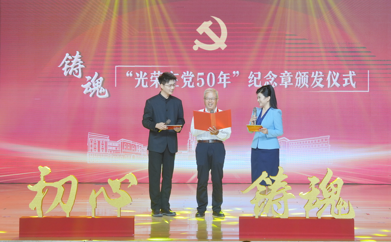 党委副书记、校长赵长林为“光荣在党50年”的老党员代表颁发纪念章。