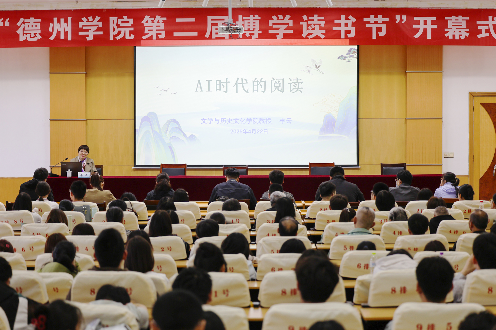 开幕式上,为获评“德州学院十大阅读之星”的学生颁发了荣誉证书。教师和学生代表分享了阅读体会和收获。文学与历史文化学院丰云教授作了题为《AI时代的阅读》的学术报告。