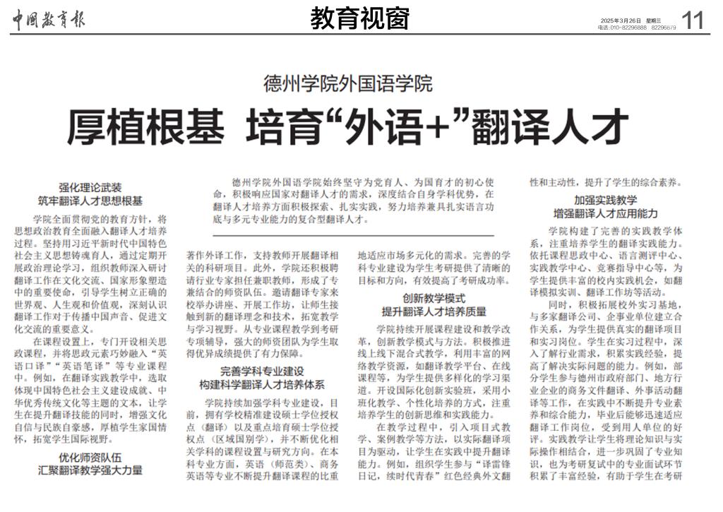 【中国教育报】德州学院外国语学院 厚植根基 培育“外语+”翻译人才