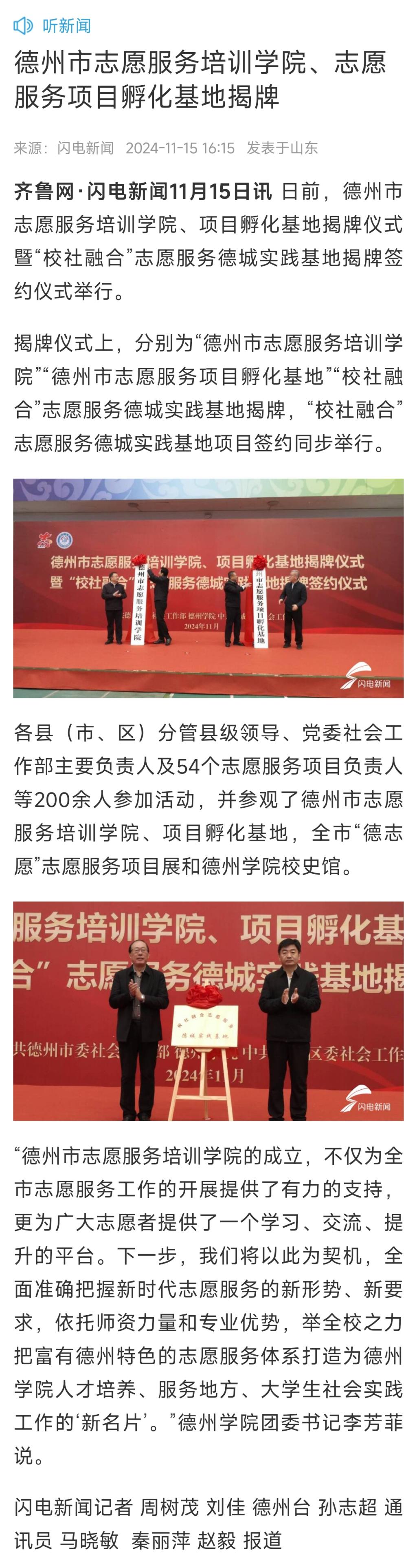 【齐鲁网】德州市志愿服务培训学院、志愿服务项目孵化基地揭牌
